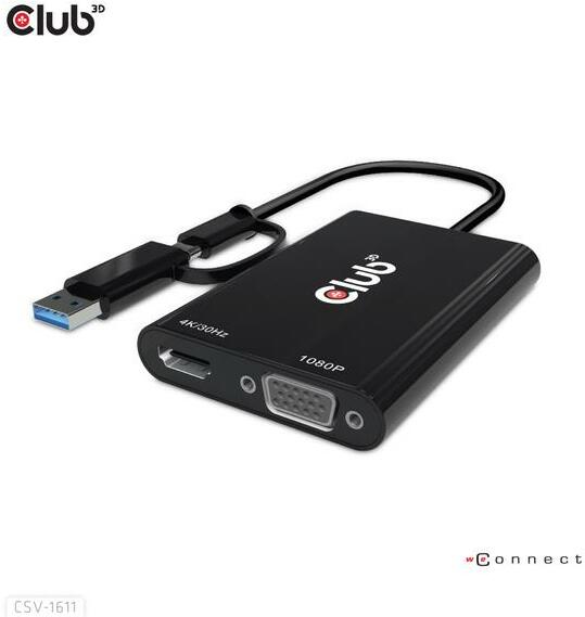 Club 3D Splitter video Club3D CSV-1611, USB C/A, Dual HDMI 4K 30Hz, VGA 1080 60 Hz (Negru) (CSV-1611)
